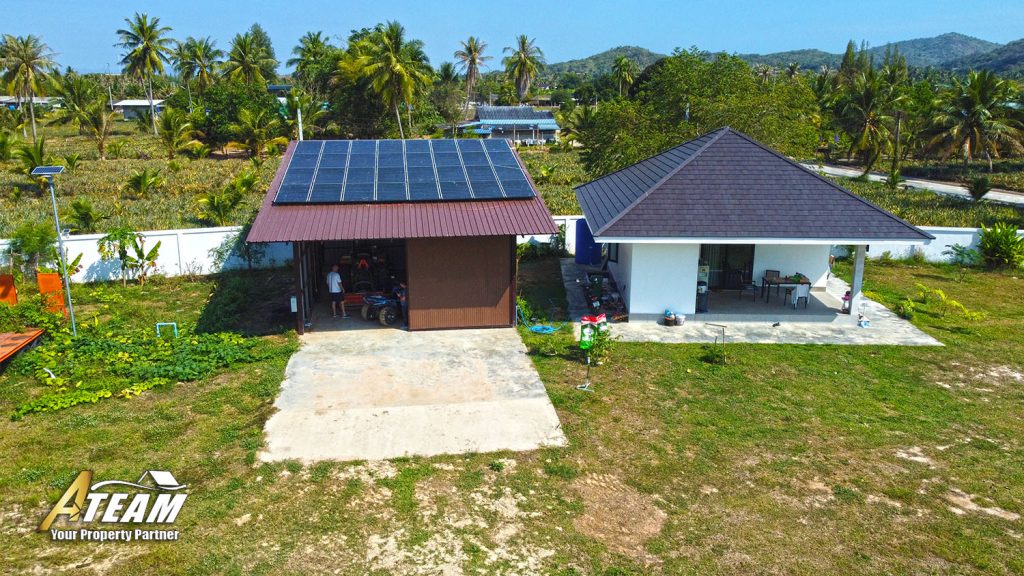 There is a wall all around the property, a 12kw solar system, a new concrete road up to the property, CCTV around the property, and 1 rai lake with a 2hp pump for irrigation of the coconut palms.